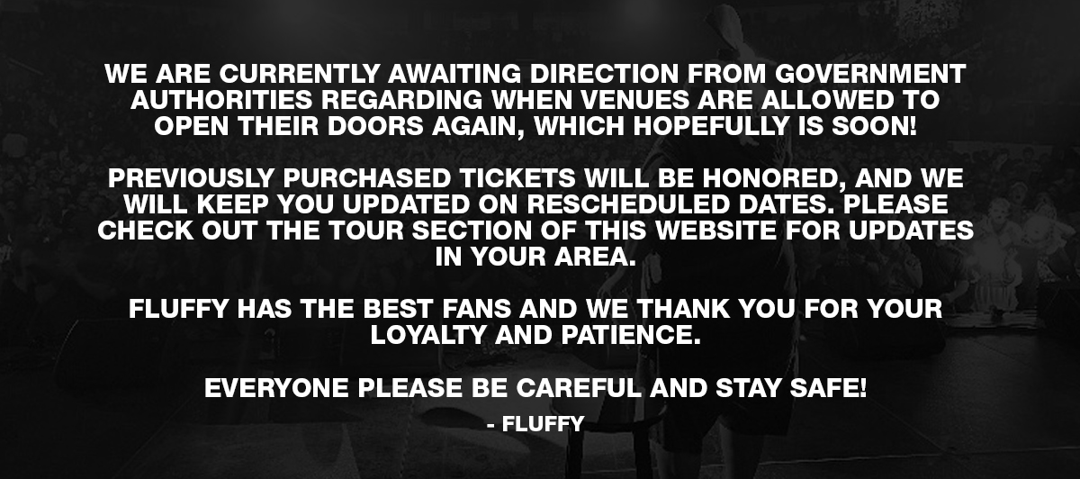 PREVIOUSLY PURCHASED TICKETS WILL BE HONORED, AND WE WILL KEEP YOU UPDATED ON RESCHEDULED DATES. PLEASE CHECK OUT THE TOUR SECTION OF THIS WEBSITE FOR UPDATES IN YOUR AREA.